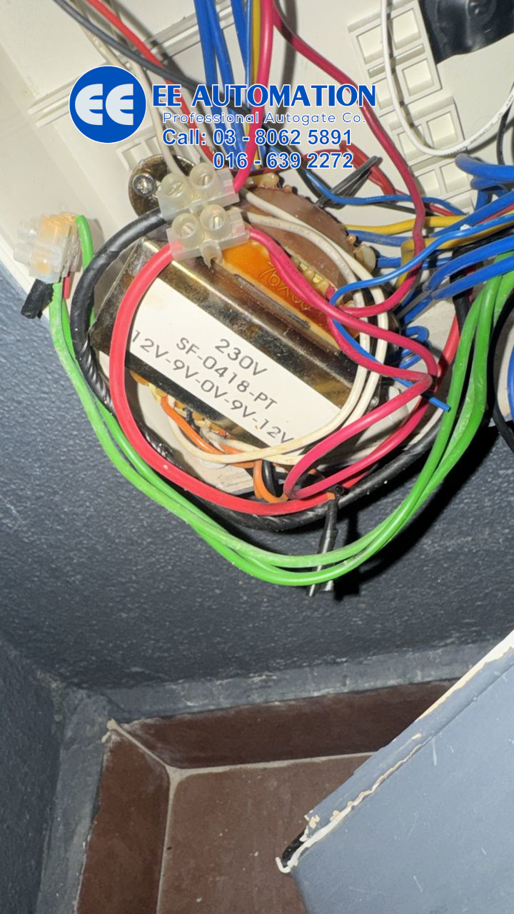 Setelah datang lakukan pemeriksaan kami dapati autogate transformer telah rosak. Bateri autogate pun sudah kong, sebab itu apabila elektrik tak ada autogate tidak berfungsi. Customer pelik sebab battery autogate itu baru beberapa bulan tukar, baru kali pertama bekalan elektrik terputus, tak akan battery sudah kong, kemungkinan bateri autogate backup yang diberikan bukan baru. Jadi sekarang kami gantikan 12v9v0v9v12v transformer autogate baru dan original, customer juga minta kami tambahkan autogate battery power.