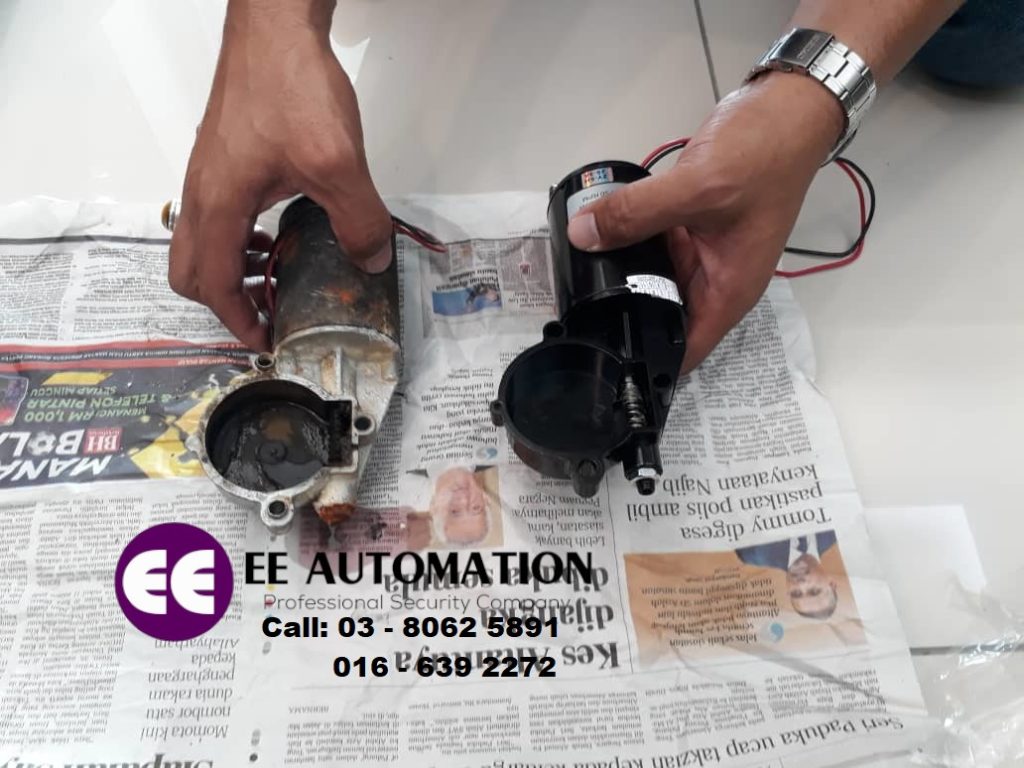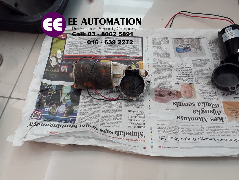 Gambar ini diambil di auto gate shop in puchong kami dimana ada seorang customer datang untuk membeli underground mini dc motor pada hari sabtu lepas, pada anda yang belum tahu, hari sabtu juga kami beropersi seperti biasa dari 9 pagi sehingga 6 petang. Yang mana perlukan servis baiki autogate, auto gate repair services dan atau pasang autogate rumah, install autogate for house boleh hubungi kami segera untuk set appointment. Berbalik pada cerita customer tadi, katanya ada beberapa auto gate supplier puchong yang beliau hubungi, semuanya tak ada underground swing auto gate spare parts. Pagi itu customer hubungi kami tanya mengenai underground autogate part, memang kami sentiasa menyimpan auto gate spareparts tidak kira type of autogate dan jenama autogate malaysia atau auto gate italy brand. Customer terus datang beli underground dc motor, memang agak teruk keadaan underground auto gate mini dc motor sebab masuk air, anda pun nampak ada air bercampur minyak bertakung. Lepas ini kalau nak cari sparepart autogate atau nak pasang autogate baru nanti, senang boleh cari kami katanya.